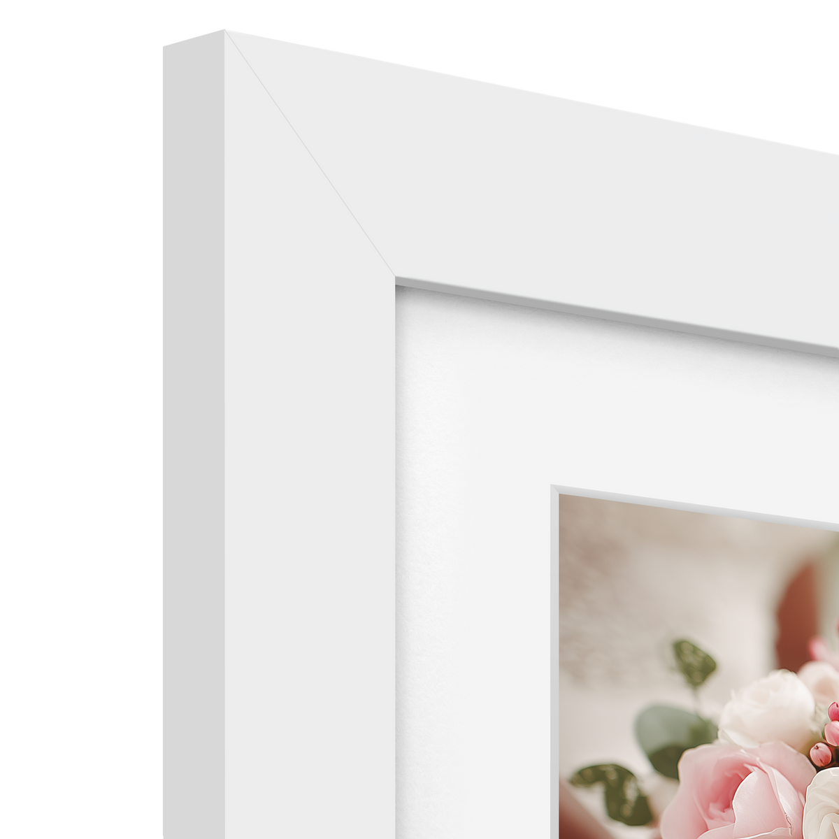 Solid wood frame with a satin white finish, ideal for showcasing memories or artwork in various sizes.